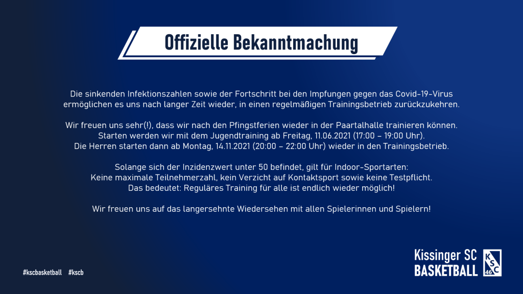 Endlich ist es soweit: die Inzidenzwerte sind so weit gesunken, dass wir endlich wieder in einen regulären Trainingsbetrieb ohne (allzu große) Auflagen starten können! Wir sind natürlich überglücklich über diese Möglichkeit und freuen uns, bald wieder viele Basketball-Begeisterte in der Paartalhalle begrüßen zu dürfen.