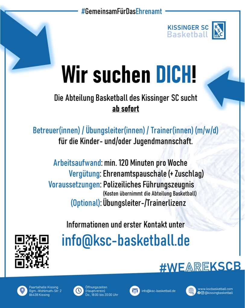 Für unsere Kinder- und/oder Jugendmannschaften sind wir mehr denn je auf der Suche nach Interessierten, die sich im Ehrenamt engagieren möchten. Gesucht wird ein(e) Trainer(in) / Übungsleiter(in) / Betreuer(in) (m/w/d) für unseren Basketball-Nachwuchs. Alle Infos rund um Zeitaufwand, Vergütung und mehr sowie Kontaktmöglichkeiten gibt es hier: