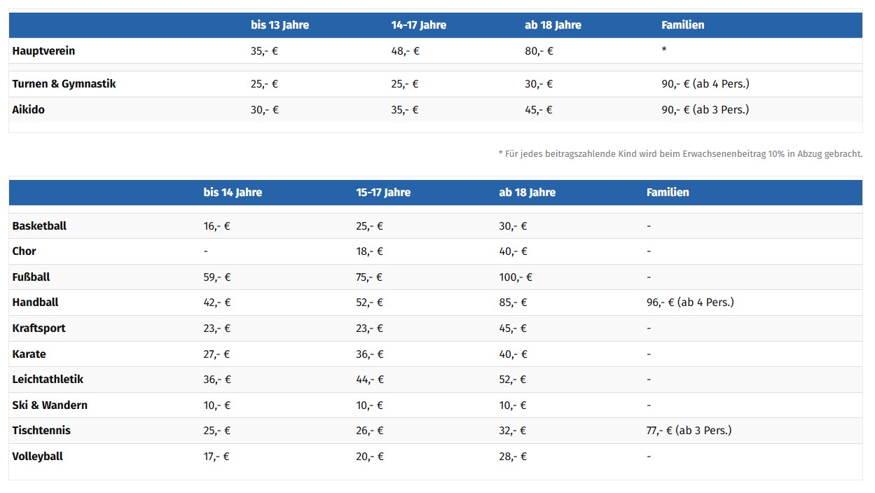Die Beiträge setzen sich zusammen aus den Jahresbeiträgen für den Hauptverein und zusätzlich der Abteilung Basketball. Die einmalige Aufnahmegebühr beträgt EUR 5,-. Die Berechnung im Jahr des Eintritts erfolgt zeitanteilig (Quartal). Kündigungen sind nur schriftlich und zum Jahresende möglich.