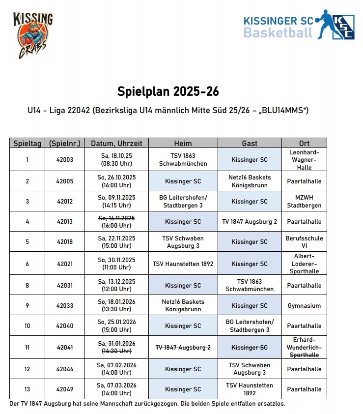 Auf Grundlage der bayerischen Schulferien sowie einiger Veranstaltungen durch den Verein oder die Gemeinde Kissing, entfallen im Laufe der Saison 2025-26 vereinzelt Trainingseinheiten. Neben den Ferien sowie folgender Auflistung aller betroffenen Termine, wird über jeden Trainingsausfall möglichst zeitnah auch gesondert informiert. [Aktuell]